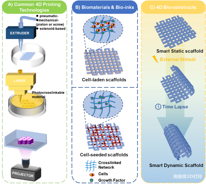 近期,浙江大学梅德庆/汪延成教授团队与美国乔治华盛顿大学Lijie Grace Zhang教授团队合作,在国际期刊Advanced Materials (IF=30.849)上在线发表题为“Emerging 4D printing strategies for next-generation tissue regeneration and medical devices”的长篇综述论文,分析并总结了面向下一代组织再生与医疗器械的4D打印技术及应用的研究进展。 4D打印技术是指在预定刺激下,3D打印的功能结构可在形状、属性和功能上进行时间维度上的自我转换。4D打印已广泛应用于柔性电子、软体机器人、生物医学支架、药物递送等领域,受到学术界和工业界的极大关注。本论文主要综述了1) 4D打印工艺分类;2) 4D打印的结构设计;3) 4D打印聚合物材料,如形状记忆聚合物(SMPs)、液晶聚合物(LCP)、刺激响应水凝胶等;4) 形状变化或功能转变的刺激响应机理;5) 4D打印支架/构造和装置等方面的最新研究(如血管组织再生和支架、心脏补片和瓣膜、脑组织重建、神经支架和导管、骨支架、肌肉再生和气管植入器械等)。在此基础上,讨论了有关4D打印的监管和商业化进展,总结了当前存在的技术挑战和发展趋势。 图1:4D打印工艺的刺激源可分为内部刺激和外部刺激,以及内应力、磁性刺激、光刺激、热刺激和化学刺激五大类及其子类型 传统3D打印的生物支架,细胞是铺设在支架上的。由于重力作用,细胞通常会在支架的不规则表面呈现非均匀分布。4D生物打印能通过对支架的刺激改变其形状,这为解决支架表面细胞不均匀沉降问题提供了一种新方法。4D打印医疗器械的另一优点是能够在微创手术中减少原位创伤,显著提高患者舒适度。考虑到损伤组织的形状不规则,在手术中植入3D打印结构使其完美贴合损伤组织仍是一大挑战,采用4D打印支架通过变形效应促进支架与缺损组织的无缝融合,能有效解决这一难题。此外,由于4D打印结构具有可变形状能力,这也为打印制造下一代生物医学器械提供了可能,包括自紧缝线、血管支架、神经支架、药物递送载体、生物传感器和生物驱动器等。在综述论文中,主要讨论了近期关于体外组织构建和体内植入的4D打印细胞支架和医疗器械的研究,以阐述其潜在的临床应用。但我们也不难发现现阶段4D打印医疗器械仍处于研发阶段,并未开展临床试验,更多的体外和体内实验仍有待进一步开展。 综上所述,4D打印用于生物医学应用是一个新兴的研究领域,已证明其在下一代组织工程和生物医学器械的突出潜力。虽然该领域还存在若干挑战,多学科的交叉与合作将会加快推进4D生物打印技术的发展,并最终实现其临床转化。 图2:4D打印组织再生示意图 (原文链接//new.qq.com/rain/a/20211230A01IXQ00)
