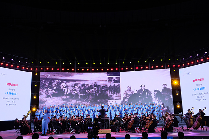 歌曲《七律·长征》的歌词是毛主席所作的七言律诗。这首七律作于红军战士越过岷山后,长征即将胜利结束前不久的途中,表达了曙光在前,胜利在望的澎湃心情。现场演唱时,合唱团成员满怀信心地走上舞台,以激昂的精神面貌完成了表演。浑厚雄伟的男低音,气势磅礴的男高音,清澈嘹亮的女高音,将中国工农红军不畏艰险、英勇顽强的拼搏精神充分展现出来。歌声震撼人心,淋漓尽致地表达了三军战士翻过千里积雪的岷山的喜悦之情。“风筝”合唱团最终取得了9.52分的好成绩,其中9.42分为合唱得分(在十四支队伍中排名第七)。