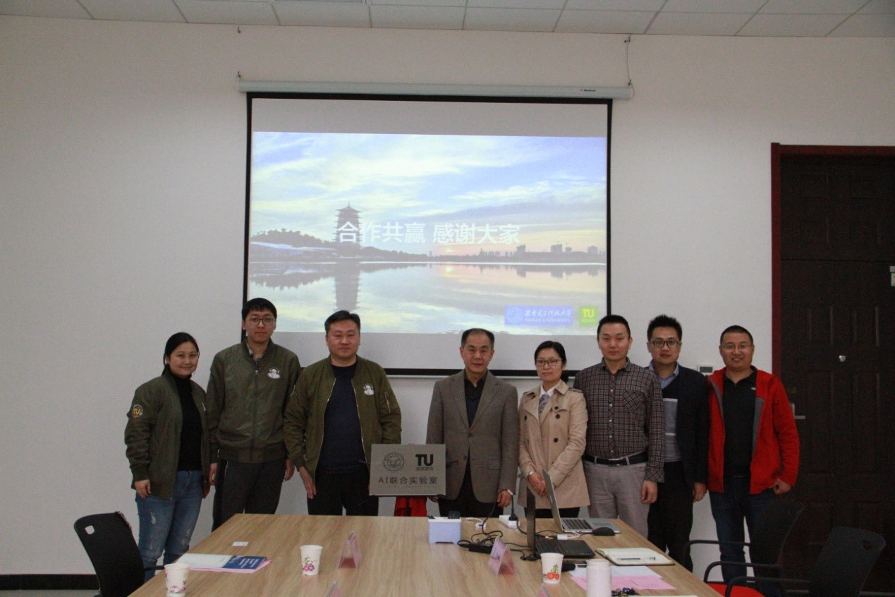 与在线途游(北京)科技有限公司共建“国产直播—途游 AI联合实验室”揭牌仪式在北校区主楼三区第二会议室成功举行。在线途游(北京)科技有限公司创始人兼CTO周欣、人力资源总监方媛媛、BI系统技术总监安晓宇、人力资源部王婷婷,国产直播
