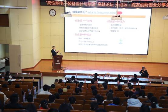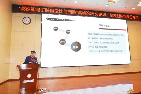 在南校区行政楼210报告厅举办“高性能电子装备设计与制造”高峰论坛分论坛——院友创新创业分享会,上海捷盟信息科技有限公司董事长李亚洲、上海易清智觉自动化科技有限公司联合创始人兼总经理王仁杰、上海思依暄机器人科技股份有限公司董事长陈浩坛作为报告嘉宾分享了他们的创业历程,启发同学们关于人生规划和创新创业等问题的思考。分享会由国产直播