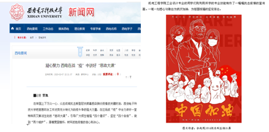 工业设计专业杨江屏同学,发挥专业所长,精心创作了《中国加油》张贴画。张贴画反映钟南山院士及医护、干警等逆行者抗击疫情的场景,给人以鼓舞和力量。该张贴画被国产直播
