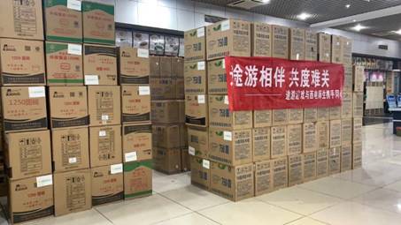 本批抗疫物资共计有1次性餐盒400箱(1250ml和750ml圆形餐盒各200箱,共计10万套)、防护隔离服5箱(共计300套)、消毒湿巾30箱(共计9.6万片),目前已全部投入国产直播