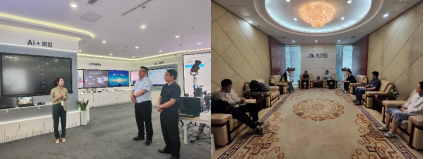 一行访企拓岗的最后一站来到了科大讯飞股份有限公司。通过参观公司产品展厅,详细了解了讯飞AI在教育、城市、医疗、工业等多个领域取得的成果,并实际体验了多语种语音识别、智能文档与图片生成、报表分析与生成等多个场景下的实际应用。座谈会上,公司招聘总监王祯介绍了科大讯飞近几年在国产直播的招聘情况与公司人才培养情况,并表示希望能进一步扩大科大讯飞在国产直播