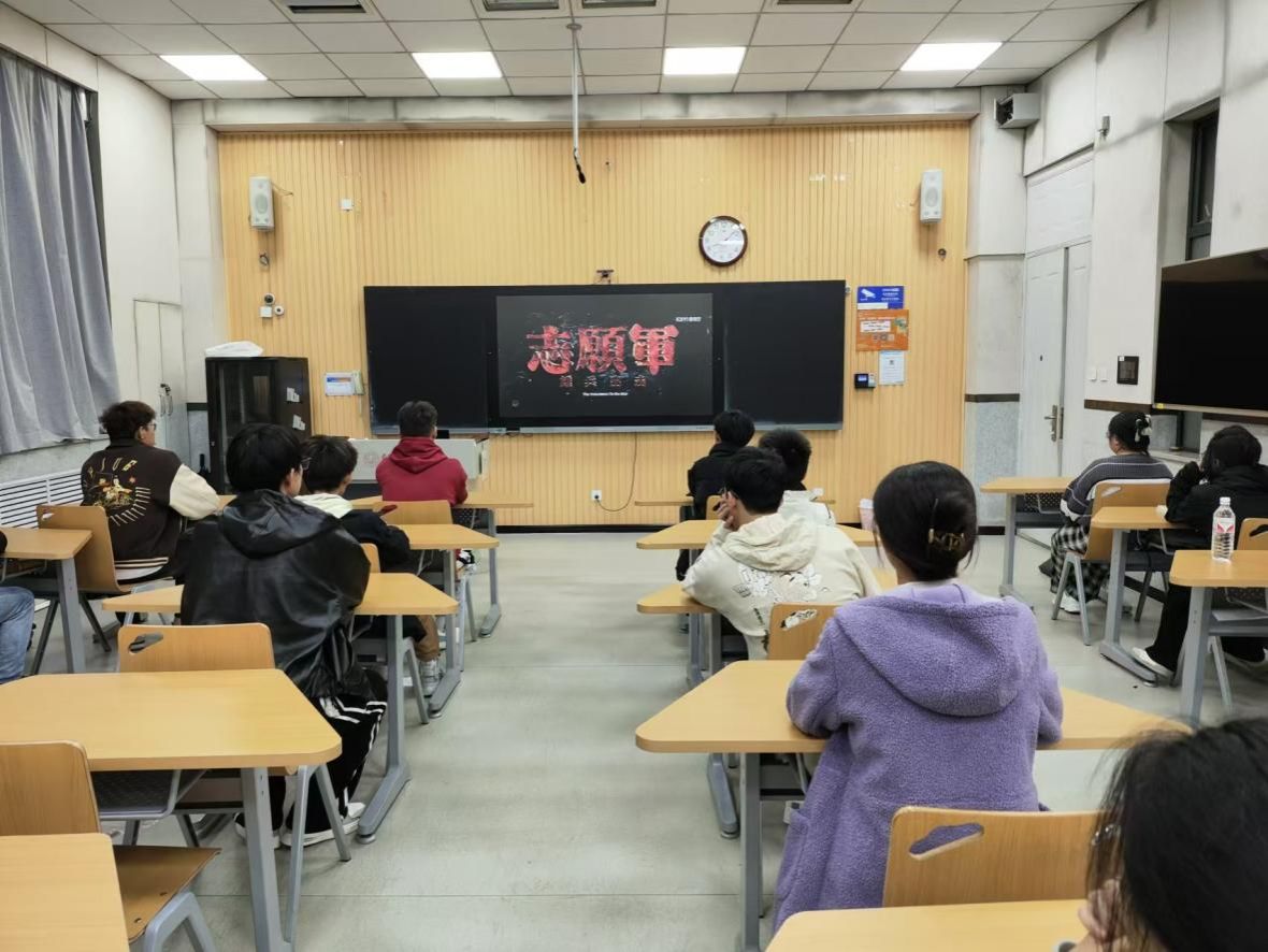 在南校区C-128组织同学们集体观看爱国影片《志愿军--雄兵出击》。该影片以抗美援朝战争为背景,通过真实的历史事件和人物塑造,展现了中国人民志愿军在极其艰苦的环境下依然英勇奋战、矢志不渝的伟大精神,展示出革命先辈不畏艰险、前赴后继的不屈意志。观影过程中,同学们全神贯注,沉浸在影片的紧张氛围和感人故事中。大家通过观看电影,深刻地认识到抗美援朝战争的历史意义,感受到战争中中国人民之间的深厚情谊,在观影中仿佛置身于那个激情燃烧的岁月。大家均为志愿军战士们的勇敢而赞叹,为他们的坚韧而感动。