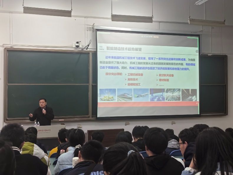 和专业的认同感。他表示,以机械工程为基础的实体制造业,已经成为国家经济的命脉,党的十八大以来,习近平总书记多次强调发展制造业的重要性。他针对智能制造系统架构和六项关键技术做了详细的讲解,让同学们建立起对智能制造技术方向的初步认知。紧接着,他从高端装备与核心技术、智能工业机器人、增材制造技术、智能车辆、智能机床、国防军工装备智能制造六个方向,介绍了智能制造技术发展趋势展望。訾斌强调,智能制造工程教育以国家战略需求为导向,培养综合素质全面发展的全方位人才。他鼓励同学们从大一起就要积极参与广泛的科研、竞赛及课外活动,同时培养专业能力与非专业能力。