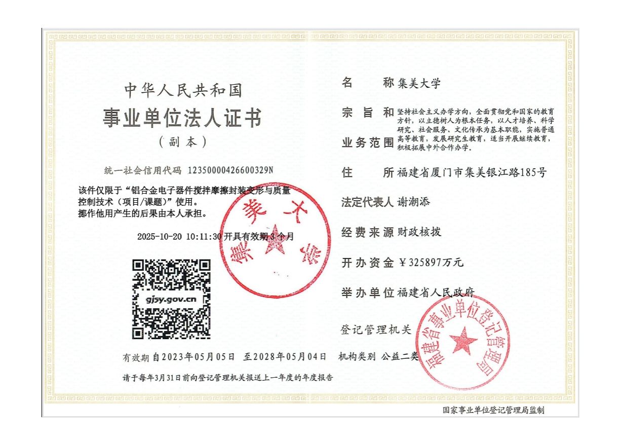 科研协作项目的管理,确保高性能集成制造实验室电子装备特种制造技术研究的顺利进行。集美大学与项目负责人李楠将开展科研合作,现将合作相关事项公示如下: