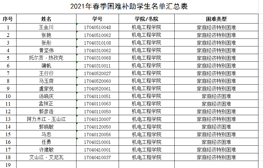 2021春季困难补助学生名单公示