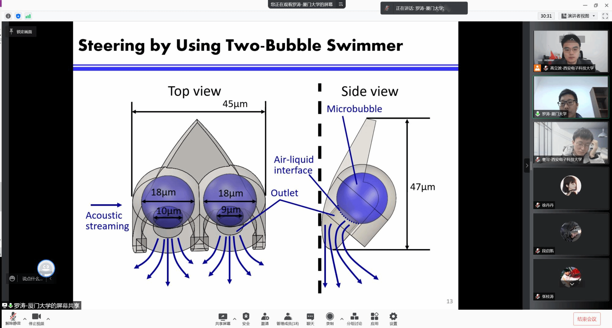 罗教授首先阐述了仿生微纳机器人在设计上的重点难点,然后从人类飞行器的发展阶段引申出了现在微纳机器人的发展原理以及发展方向等方面进行了介绍,之后介绍了空气微泡的结构及功能组成,最后强调了空气微泡在人体的疾病检测以及治疗等领域的应用。