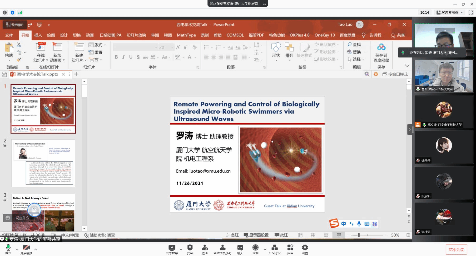工程系助理教授应邀在线上作了题为《Remote Powering and Control of Biologically Inspired Micro-Robotic Swimmers via Ultrasound Waves》的学术报告。本次报告因疫情原因改为线上,高立波,王明智,曹可等测控系师生参加,高立波副教授主持。