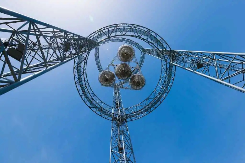 “逐日工程”空间太阳能电站地面验证系统位于国产直播南校区,其支撑塔为75m高的钢结构,验证系统主要包括五大子系统:欧米伽聚光与光电转换、电力传输与管理、射频发射天线、接收与整流天线、控制与测量。其工作原理,首先是根据太阳高度角确定聚光镜需要倾斜的角度,在接收到聚光镜反射的太阳光后,位于聚光镜中心的光伏电池阵,将其转化为直流电能。随后,通过电源管理模块,四个聚光系统转换得到的电能汇聚到中间发射天线,经过振荡器和放大器等模块,电能被进一步转化为微波,利用无线传输的形式发射到接收天线。最后,接收天线将微波整流再次转换成直流电,供给负载。