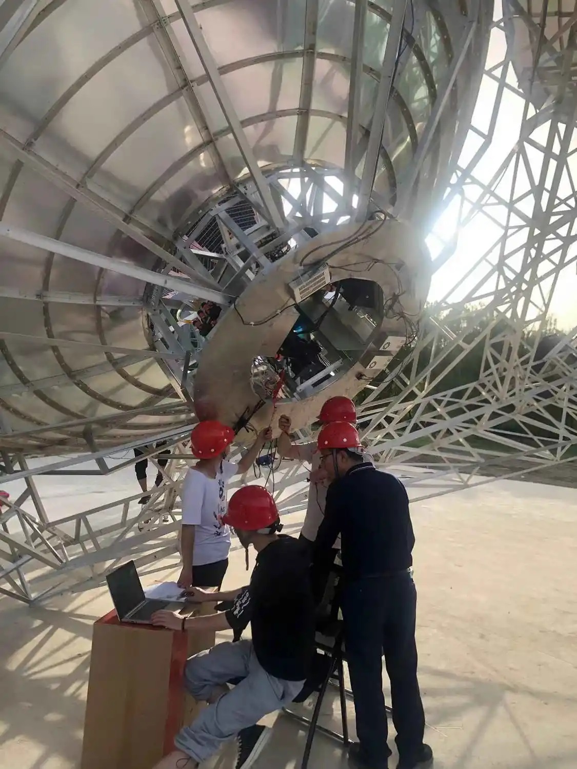 有一天深夜,天气预报显示一场暴雨将在几个小时以后抵达。刚刚在南校区试验场测量完聚光器型面精度,张逸群正打算将空中系统落地回收、搬回库房时,却发现了一个自己难以解决的问题:空中系统和地面支撑运输结构难以完全装配,这里牵扯到了结构和控制诸多因素。一个小时的无果尝试之后,眼看乌云密布,他拨通了远在20里外北校区的另一位团队骨干陈光达教授的微信视频。又是一个小时的远程讨论,无果。此时已是凌晨两点,一辆轿车从北校区的南门驶出,半个小时后,陈光达出现在满头大汗的张逸群身旁。此刻,雷声滚滚,他们终于在大雨到来的最后一刻之前,将空中系统完美降落在地面支撑运输结构上,将系统完整无缺地搬回到了库房。